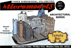 Kit: As detailed elsewhere in this issue, Matt Sparks has obtained North American rights to the Micromodels name, logo, and distribution, mainly for the purpose of continuing Geoffrey Heighway's work in creating highly detailed and extremely miniaturized replicas, in card, of important cultural and historical creations. Matt's first release under the new Micromodels USA designation is the Temple Bar Gate, the only one of the eight gates through the London wall to survive into the present time. (The gate's history is well detailed in the wrapper notes.) It's also the only gate that Heighway did not release with the original Micromodels line, and in this sense completes a project that the originator may have had in mind before his death.