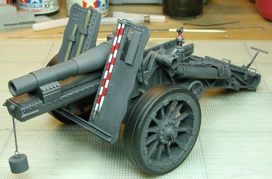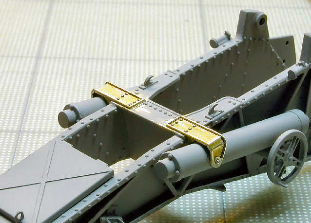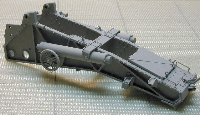 The following photo shows the carriage as completed so far. The next article in the series will discuss completion of the undercarriage and finishing of the gun carriage, including final coloring.