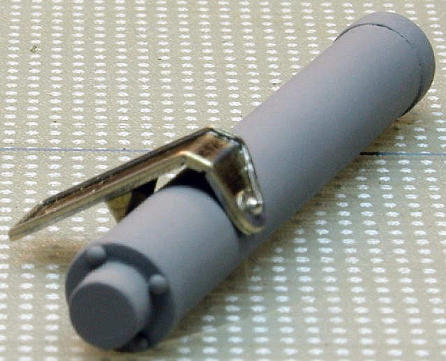 Tip: Working with very little rivets is not so difficult. Make a hole of the correct diameter (same as the rivet's shaft) in the right spot on the model. If you want do mount the rivet in 0.3 mm sheet metal, you also need a scrap piece of the same material with the same size hole. Put the rivet in the hole of the scrap material and cut the excess length with side cutters to make it as short as possible. Take a fine needle file and remove the rest of the shaft until it is flush with the scrap metal. Remove it and turn it, so that the round head is at the top. Apply it with very fine tweezers in the hole at the model and attach it carefully with very thin colorless paint. (I use Gunze's Mr. Metal Primer). I've found the best tweezers to be those used for handling very small surface-mounted electronics components. [Editor's note: Look for these on the Internet from electronics tool distributors.]