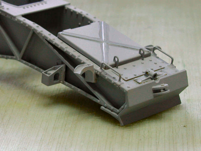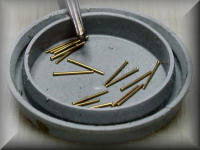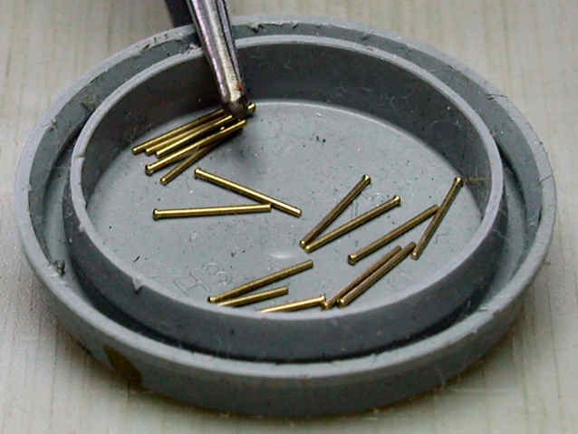 All rivets were real ones, made of brass, purchased from Hassler-Profile in Liechtenstein. They have a shaft of 0.5 mm and a head of 0.8 mm. After shortening the shaft to a length of 0.3 mm (thickness of the brass sheet), I glued them with Gunze's Mr. Metal-Primer into the etched holes.