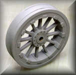 The main carriage wheels were completed after I redid the outer surface (the part that contacts the ground). I happened to make a little mistake, the middle strip of the tread was not exactly in the middle, so I ground it away and added a replacement piece. The little cone near the axle was made with the original paper part and strengthened with superglue.