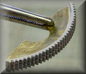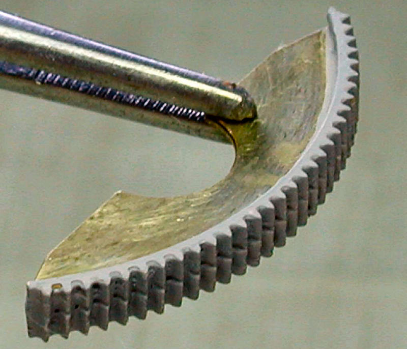 Each of the two handwheels of the elevation adjustment was made of 4 brass parts (two inner parts with the spokes and two outer rings) which were soft welded together. After this I put them in a mini drill to grind and polish them with low rotation to a soft outline. The handle was a little piece of steel wire, which was also soft welded in place. You can see one of the handwheels near the left side of the accompanying photo.